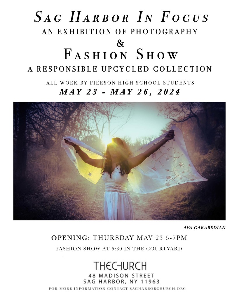 SAG HARBOR IN FOCUS AN EXHIBITION OF PHOTOGRAPHY FASHION SHOW A RESPONSIBLE UPCYCLED COLLECTION ALL WORK BY PIERSON HIGH SCHOOL STUDENTS MAY 23 - MAY 26, 2024 OPENING: THURSDAY MAY 23 5-7PM FASHION SHOW AT 5:30 IN THE COURTYARD THECHURCH 48 MADISON STREET SAG HARBOR, NY 11963 FOR MORE INFORMATION CONTACT SAGHARBORCHURCH.ORG